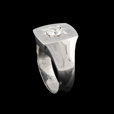 Mens ring with centre round Natural Diamond of 0.57ct (Estimated grading: J SI). Platinum - 850, matt & polished finish. Ring size R1/2. Band width: 5.0mm - 6.5mm. Weight: 17.6g. (Pre-owned)