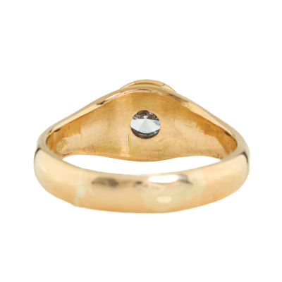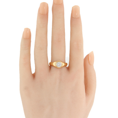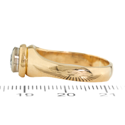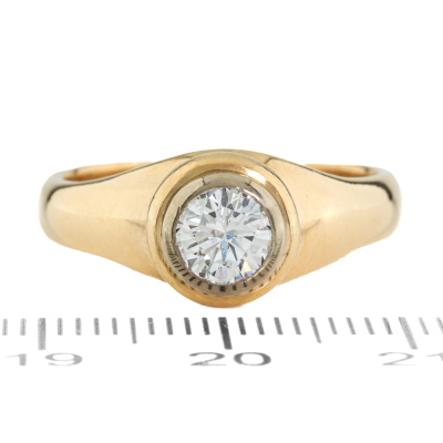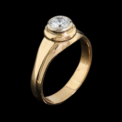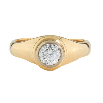 Diamond solitaire ring with round Natural Diamond of approximately 0.58ct. (Estimated grading G VS2). 18ct yellow gold and white gold. Ring size: Q1/2. Band width: 3.8mm - 4mm. Weight: 8.3g (Pre-owned)