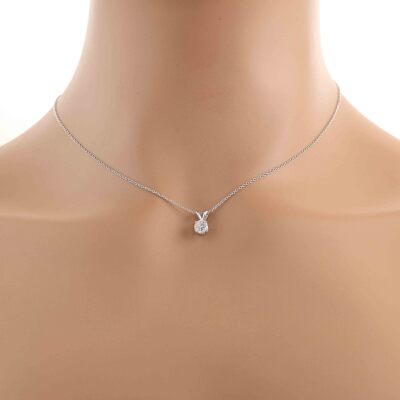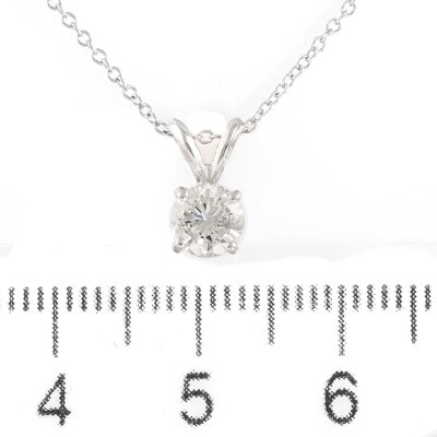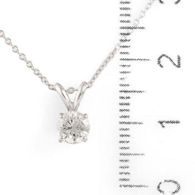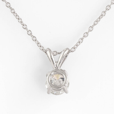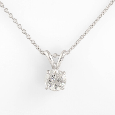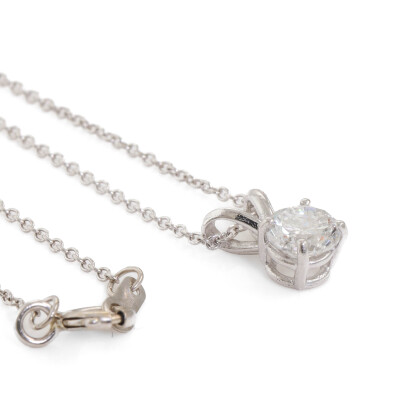 Diamond solitaire pendant with round brilliant cut Natural Diamond of 0.59ct (Estimated grading: I-J P2). Platinum with 18ct white gold 40cm chain. Weight: 1.8g (New)