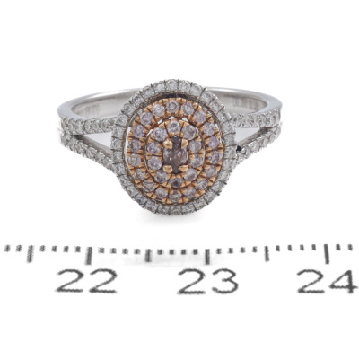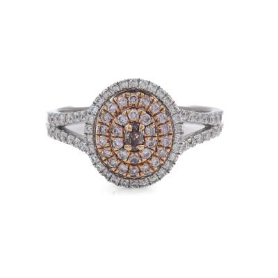 Diamond dress ring with oval shape Natural Pink Diamond of 0.07ct and remaining round pink & white Natural Diamonds totalling 0.52ct (Estimated grading: Fancy Light Pink & I P1). 18ct rose and white gold. Ring size N. Band Width: 2.1mm - 2.6mm. Weight: 4.5g. (As new)