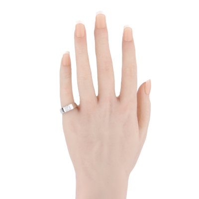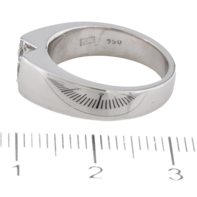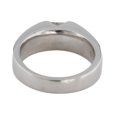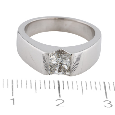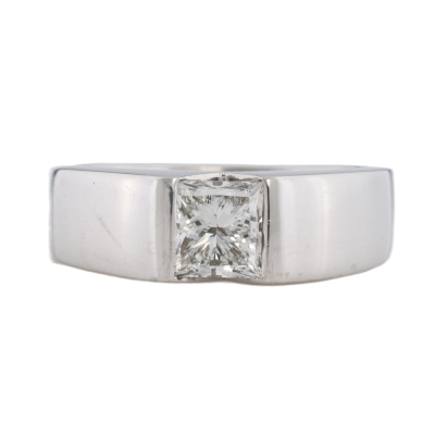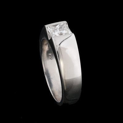 Diamond solitaire ring with a flush set princess cut Natural Diamond of approximately 0.60ct (Estimated grading: G-H SI1). 18ct white gold. Ring size J. Band width: 3.6mm-5.8mm. Weight: 9.1g.