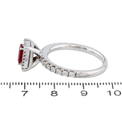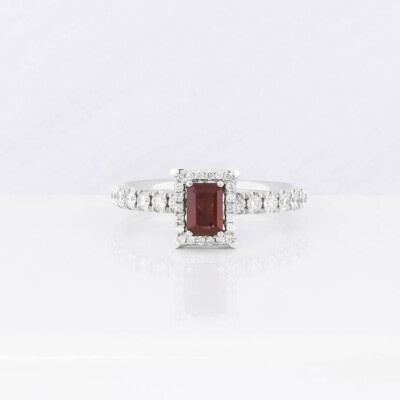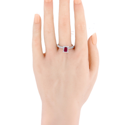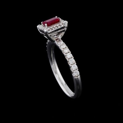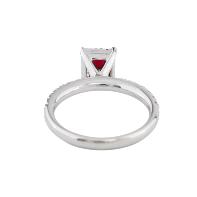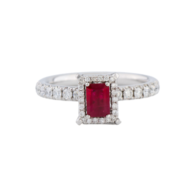 Ruby and Diamond ring with centre emerald cut Natural Ruby of approximately 0.60ct and round Natural Diamonds totalling 0.52ct (Estimated grading G-H VS-SI). Platinum 950. Ring size: S1/4. Band width: 2.8mm. Weight: 9.1g. (Pre-owned)