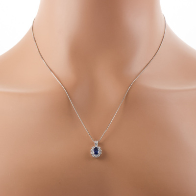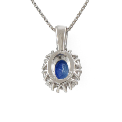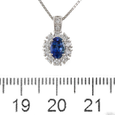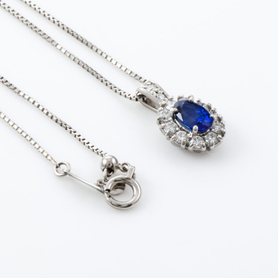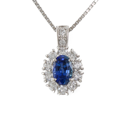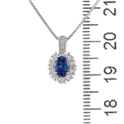 Sapphire and Diamond pendant with an oval shape Natural Blue Sapphire of 0.61ct and round Natural Diamonds totalling 0.32ct (Estimated grading: H SI). Platinum - 900 and Platinum - 850 adjustable 46cm chain. Weight: 3.8g. (Pre-owned)