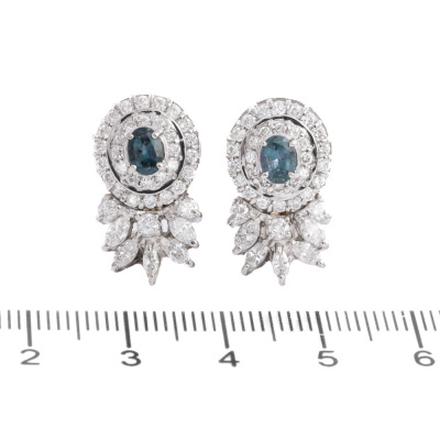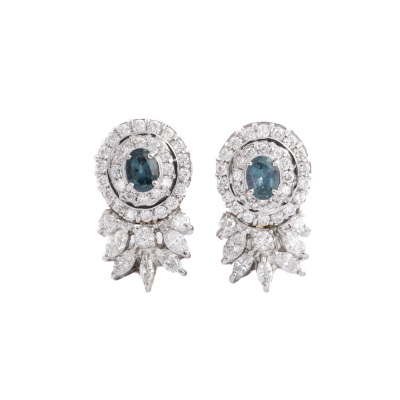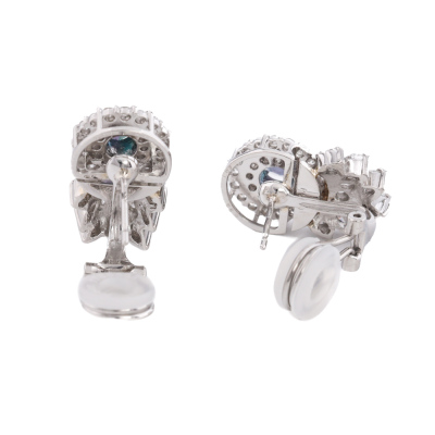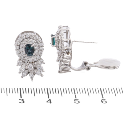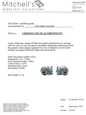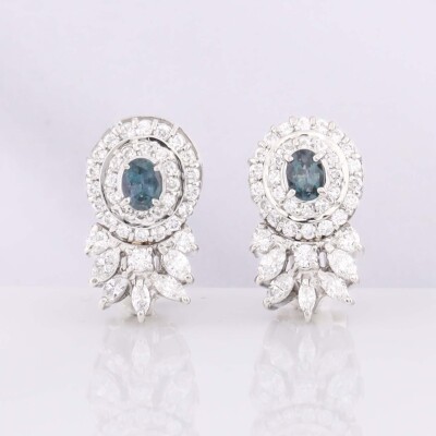 Clip-on earrings (for pierced ears) with 2 oval shape Natural Alexandrite totalling 0.62ct (Moderate colour change from greenish blue to purple) and round & marquise cut Natural Diamonds totalling 2.00ct (Estimated grading: G VS). Platinum - 900. Weight: 13.1g excluding silicon backing. With Certificate #421258. (Pre-owned)