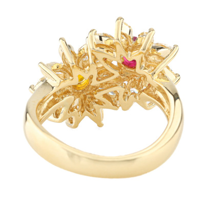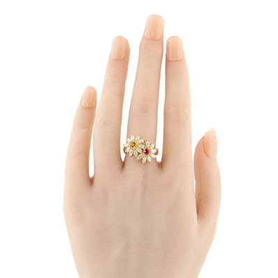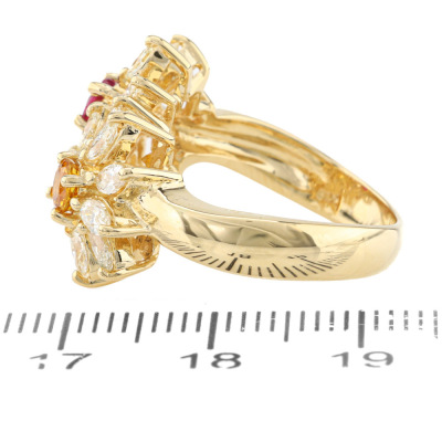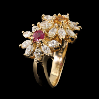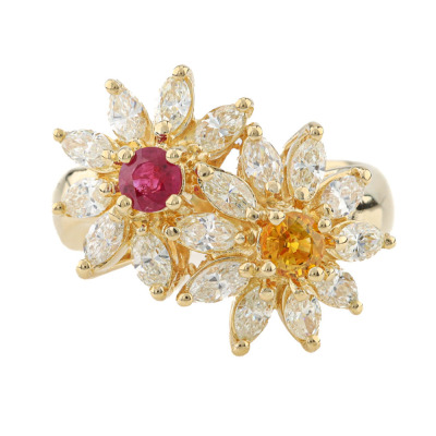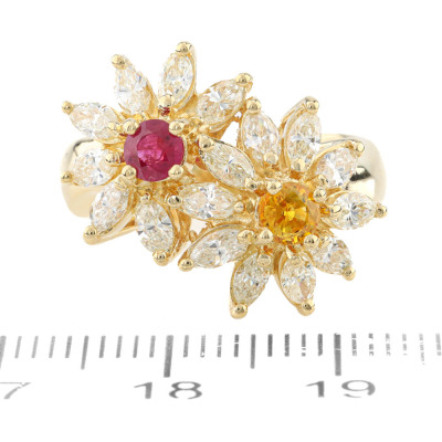 Floral design ring with a round Natural Ruby & a round Natural Yellow Sapphire totalling approximately 0.62ct and marquise cut Natural Diamonds totalling 1.21ct (Estimated grading: I-J VS). 18ct yellow gold. Ring size L. Band width: 3.5mm - 4.5mm. Weight: 8.5g. (Pre-owned)