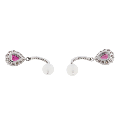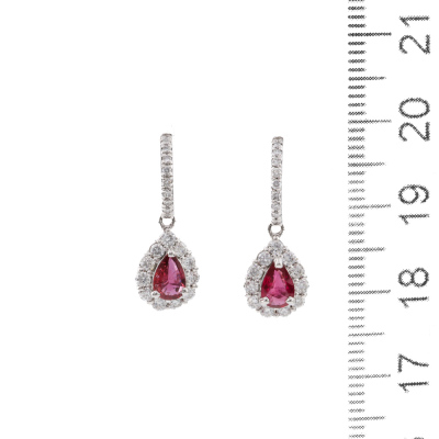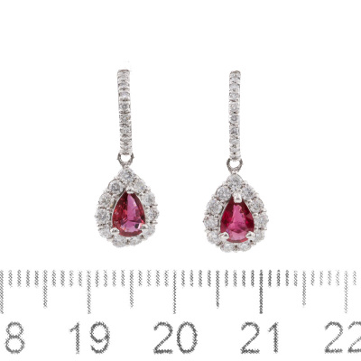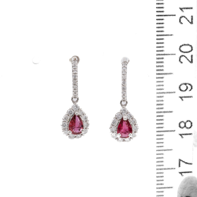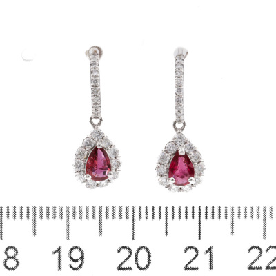 Ruby and Diamond drop earrings with pear shape Natural Rubies totalling 0.64ct and round Natural Diamonds totalling 0.56ct (Estimated grading: G-H SI). Platinum - 900 with silicon backs. Weight: 3.0g. (Pre-owned)
