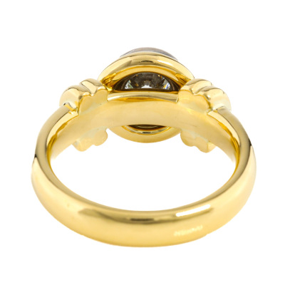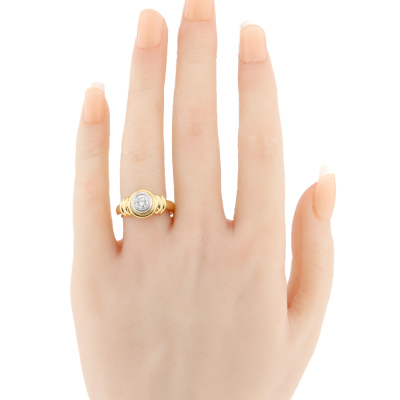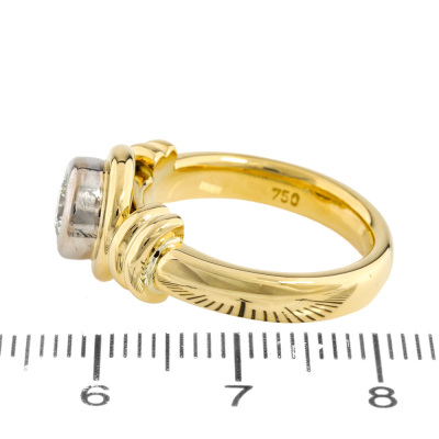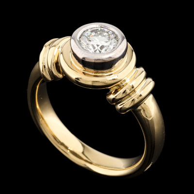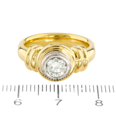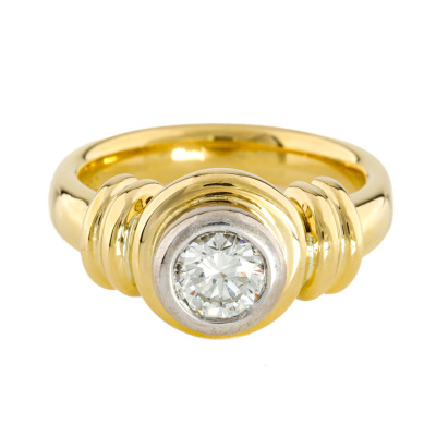 Diamond Solitaire ring with centre round Natural Diamond of approximately 0.65ct (Estimated grading: J VS). 18ct yellow and white gold. Ring size M. Band width: 3.8mm. Weight: 10.7g. (Pre-owned)