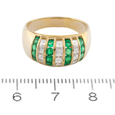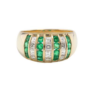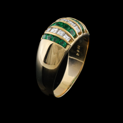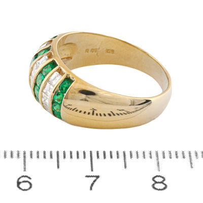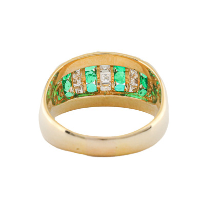 Emerald and Diamond ring with round Natural Emeralds totalling 0.65ct and carre cut Natural Diamonds totalling 0.64ct (Estimated grading: H SI). 18ct yellow gold. Ring size: L1/2. Band width: 3.4mm - 5.7mm. Weight: 6.2g. (Pre-owned)