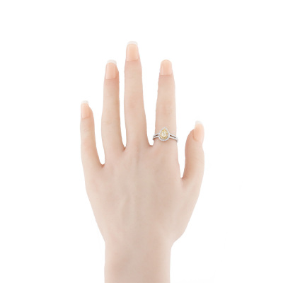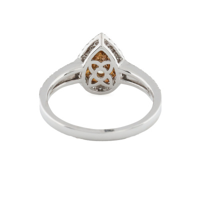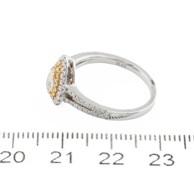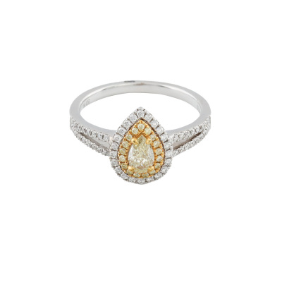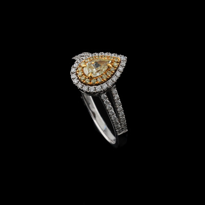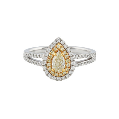 Diamond Dress ring with centre pear shape natural Yellow Diamond of 0.35ct (Estimated grading: Fancy Yellow SI2-P1) and remaining round yellow & white Natural Diamonds totalling 0.34ct (Estimated grading: Fancy Yellow SI2, G-H SI). 18ct yellow and white gold. Ring size N. Band width: 3.6mm - 1.8mm. Weight: 3.8g. (As new)