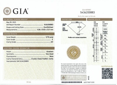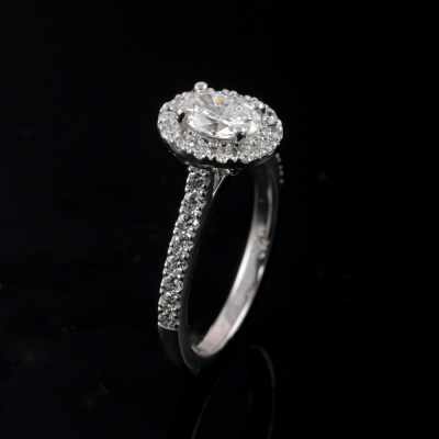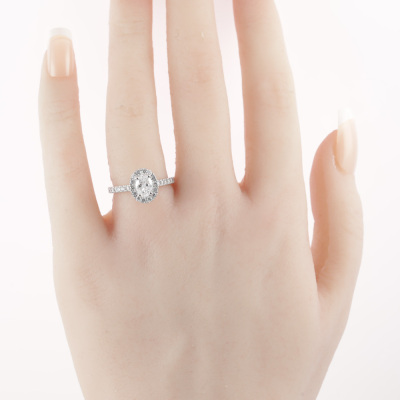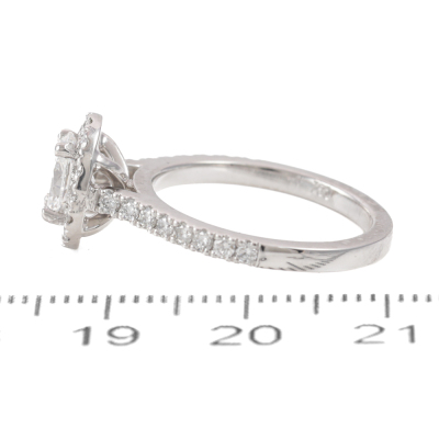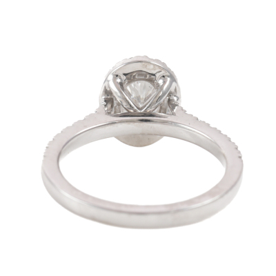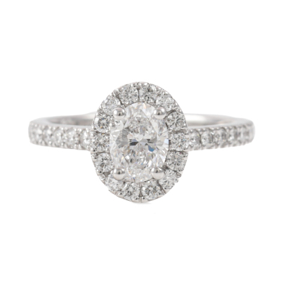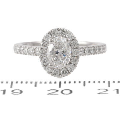 Diamond halo engagement ring with a centre oval shape Natural Diamond of 0.70ct (GIA Dossier Report graded as E SI1 #5436200883) and surrounding round Diamonds totalling approximately 0.50ct (Estimated grading G-H VS). 18ct white gold. Ring size K. Band width: 2.0mm. Weight: 4.4g. (Pre-owned)