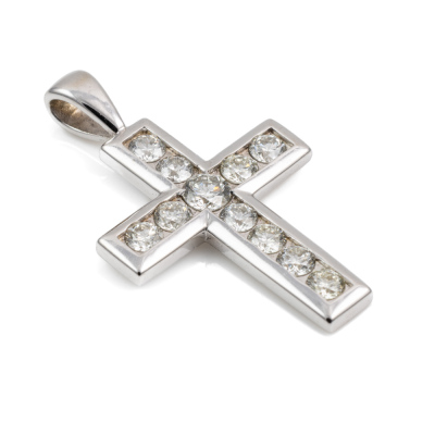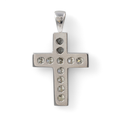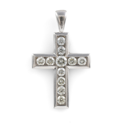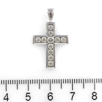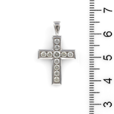 Diamond cross pendant with round Natural Diamonds totalling 0.70ct (Estimated grading: J-K SI). 18ct white gold. No chain provided. Weight: 2.7g. (As New)