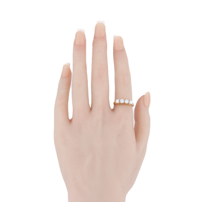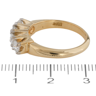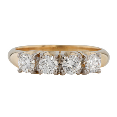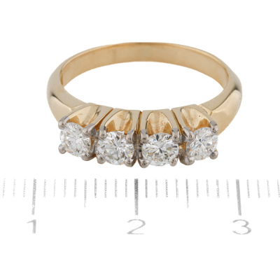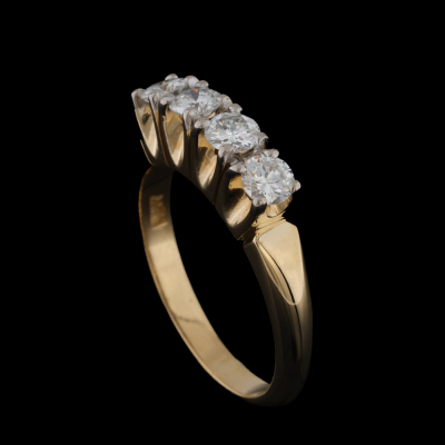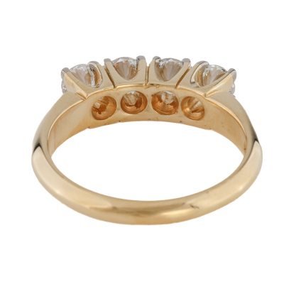 Diamond eternity ring with 4 round Natural Diamonds totalling approximately 0.70ct (Estimated grading: G-H VS). 18ct yellow gold with white rhodium plating prong tips. Ring size M1/2. Band width: 2.4mm - 3.0mm. Weight: 5.5g.