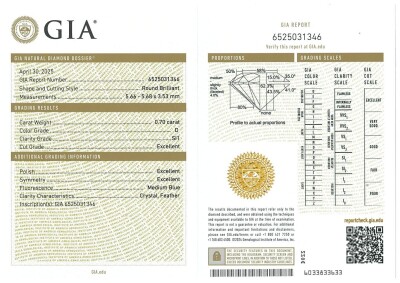 Diamond solitaire pendant with round brilliant cut Natural Diamond of 0.70ct (with GIA Diamond Report graded as D SI1 #6525031346). Platinum with 18ct white gold 40.5cm chain. Weight 2.9g (New)