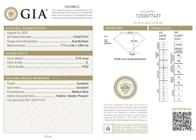 A loose oval shape natural Diamond of 0.70ct (with GIA Summary Report graded as D VVS2 #1232677427 ) .