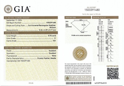 A loose radiant cut Natural Diamond of 0.70ct (With GIA Diamond Dossier report graded as G VS1 #1503391480