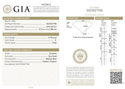 A loose emerald cut Natural Diamond of 0.70ct (with GIA report graded as G VVS2 #5523027700