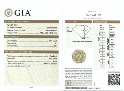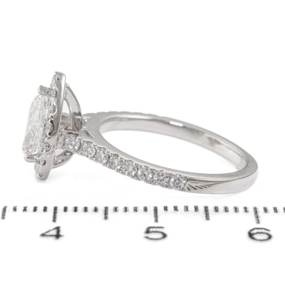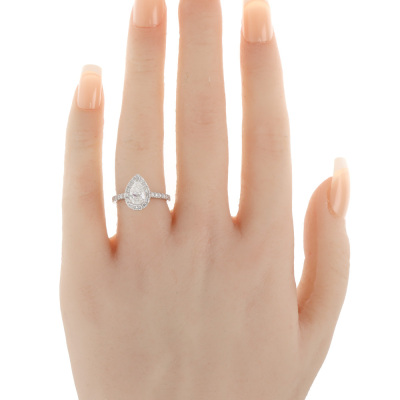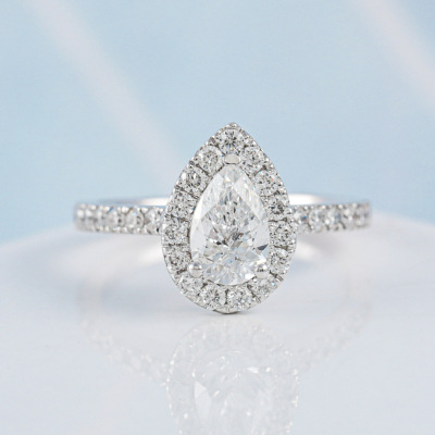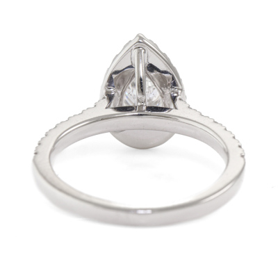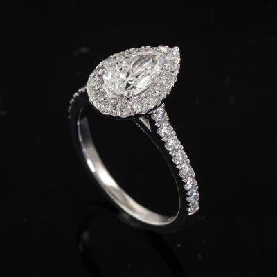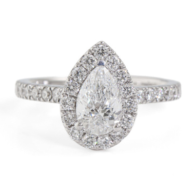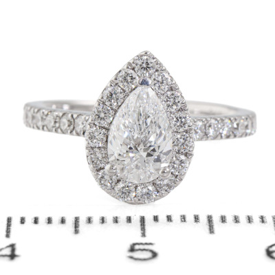 Diamond halo ring with a centre pear shape Natural Diamond of 0.71ct (GIA Dossier Report graded as E SI1 #6431241132) and surrounding round Natural Diamonds totalling approximately 0.51ct (Estimated grading H-I SI). 18ct white gold. Ring size: I1/2. Band width: 1.8mm. Weight: 3.8g. (As New)