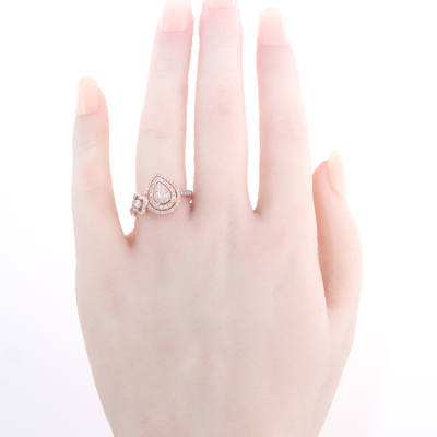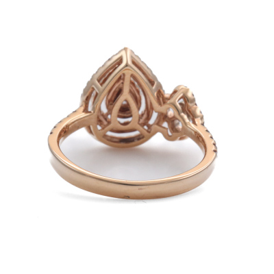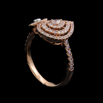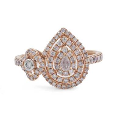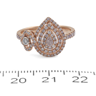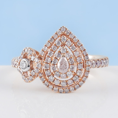Diamond dress ring with a pear shape Natural Light Pink Diamond of 0.10ct and remaining round white & pink Natural Diamonds totalling 0.61ct (Estimated grading: Fancy Purplish Pink - Light Pink H SI-P1). 18ct rose and white gold. Ring size N. Band Width: 2.4mm - 2.2mm. Weight: 4.3g. (As new)