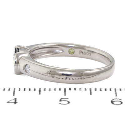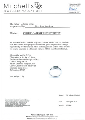 Alexandrite and Diamond ring with oval shape Natural Alexandrite of 0.72ct (Moderate colour change from bluish green to purple), two round Natural Diamonds totalling 0.04ct on the ring shoulder and a round Natural Fancy Yellow Diamond of 0.01ct inside the ring band. Platinum - 900. Ring size L1/2. Band width: 2.5mm - 3.1mm. Weight: 5.3.g. With Certificate #420402. (Pre-owned)