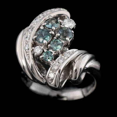 Alexandrite and Diamond ring with oval shape Natural Alexandrite's (moderate colour change from bluish green to purplish red) totalling 0.72ct and round Natural Diamonds totalling 0.28ct. Platinum - 900. Ring size L. Band width: 2.5mm - 2.7mm. Weight: 13.5g. (Pre-owned)