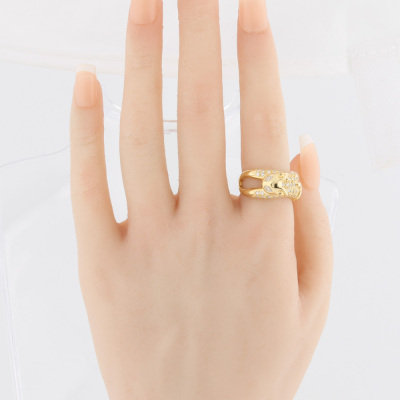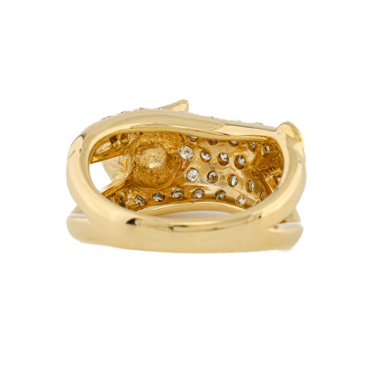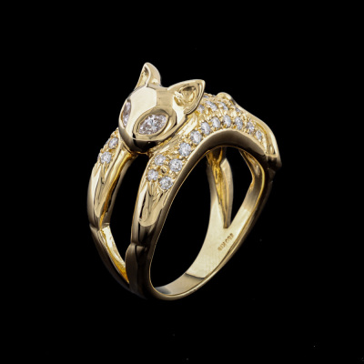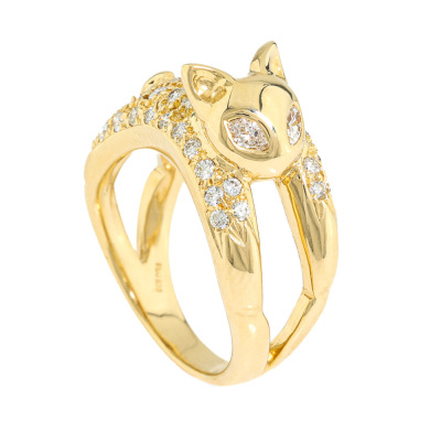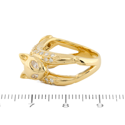 Cat design ring with round & marquise cut Natural Diamonds totalling 0.72ct (Estimated grading: G-I VS). 18ct yellow gold. Ring size: L. Band width: 3.0mm - 4.4mm. Weight: 10.3g. (pre-owned)