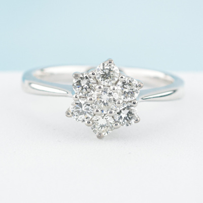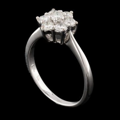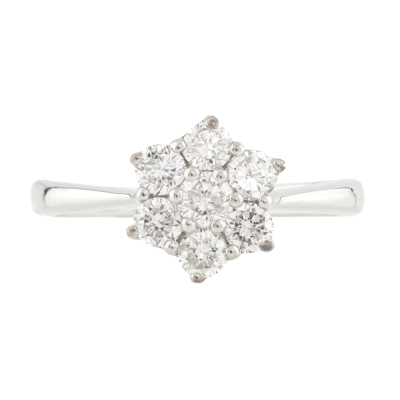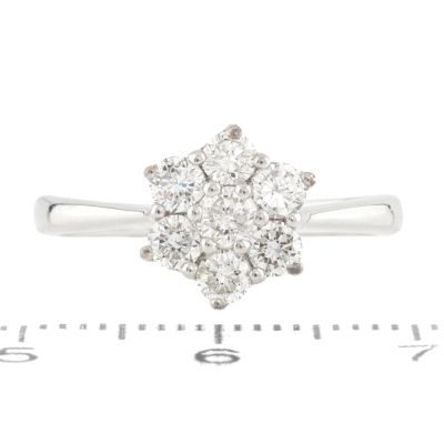 Diamond dress ring with 7 round Natural Diamonds totalling approximately 0.72ct (Estimated grading: H-I SI2). 14ct white gold. Ring size M. Band width: 1.9mm-2.2mm. Weight: 3.0g. (Pre-owned)