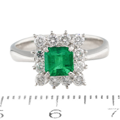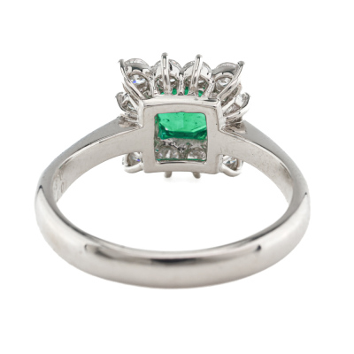 Emerald and Diamond ring with centre square emerald cut Natural Emerald of 0.72ct and round Natural Diamonds totalling 0.56ct (Estimated grading: G-H SI). Platinum - 900. Ring size M. Band width: 2.9mm - 2mm. Weight: 6.2g. (Pre-owned)