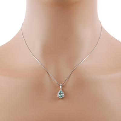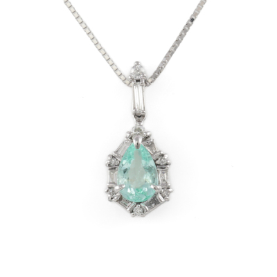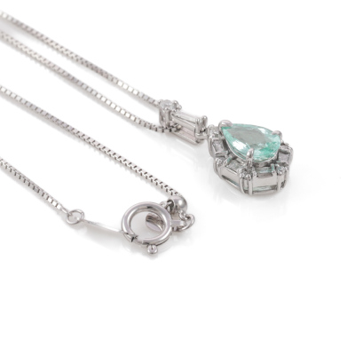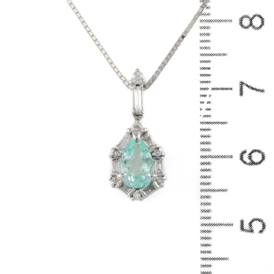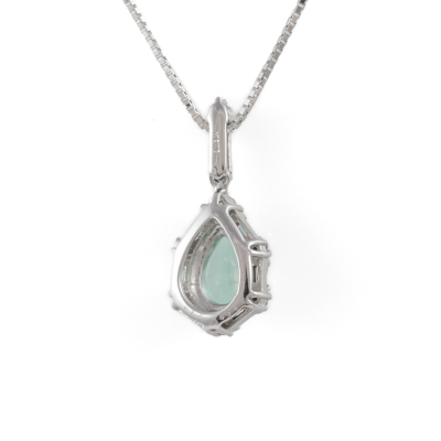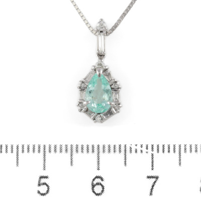 Paraiba and Diamond pendant with a pear shape Natural Paraiba Tourmaline of 0.72ct and round & baguette cut Natural Diamonds totalling 0.24ct. 18ct white gold with 45cm 18ct white gold adjustable chain. Weight: 3.7g. (Pre-owned)
