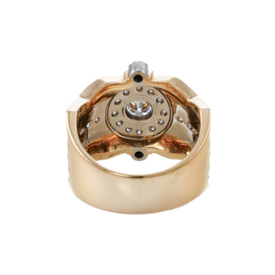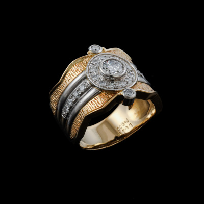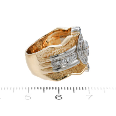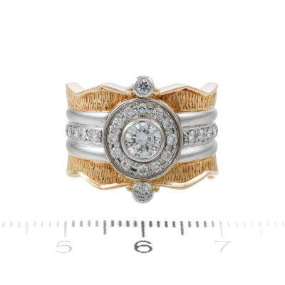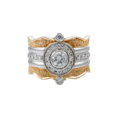 Diamond dress ring with centre round Natural Diamond of 0.39ct (Estimated grading: G VS) and remaining round Natural Diamonds totalling 0.34ct (Estimated grading: G-H VS-SI). Platinum - 900 and 18ct yellow gold. Ring size M. Band width: 7.2mm - 8.2mm. Weight: 13.0g. (Pre-owned)
