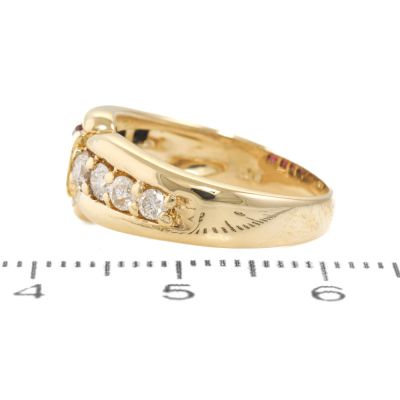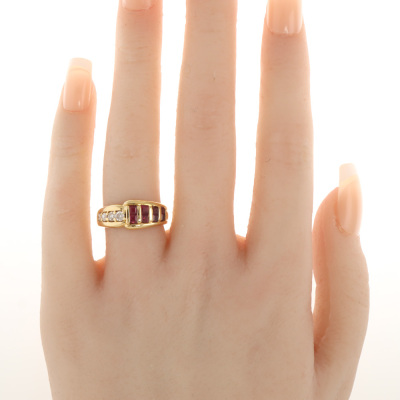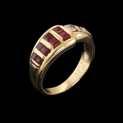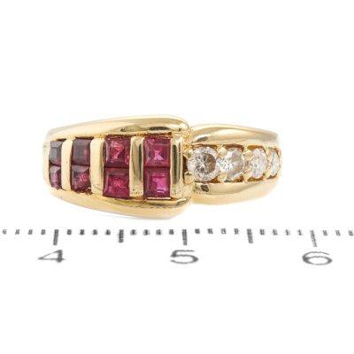 Ruby and Diamond ring with carre cut Natural Rubies totalling 0.73ct and round Natural Diamonds totalling 0.29ct. 18ct yellow gold. Ring size J3/4. Band width: 2.6mm - 4.6mm. Weight: 5.8g. (Pre-owned)