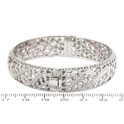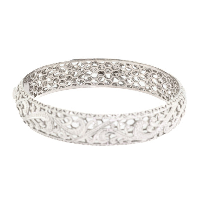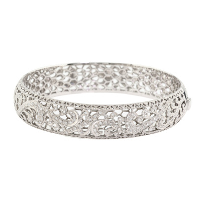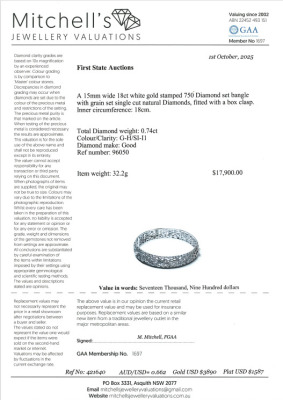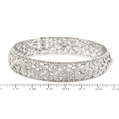 Diamond bangle with round Natural Diamonds totalling 0.74ct (Estimated grading: G-H SI-P1). 18ct white gold. Inner circumference: 180mm. Width: 15mm. Weight: 32.2g. With Certificate #421640. (Pre-owned)