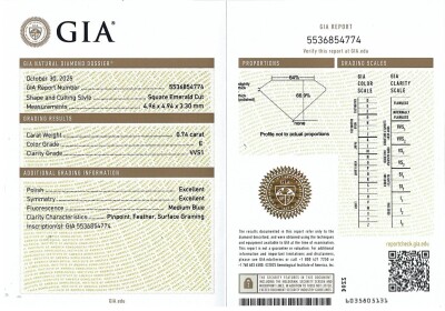 A loose square emerald cut Natural Diamond of 0.74ct (with GIA Dossier Report graded as E VVS1# 5536854774) (New)
