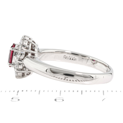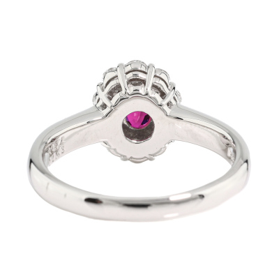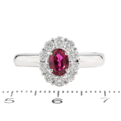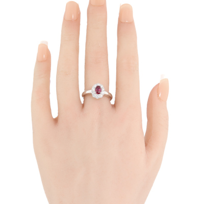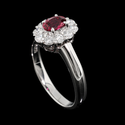 Ruby and Diamond ring with oval shape Natural Ruby of 0.74ct and round Natural Diamonds totalling 0.53ct (Estimated grading: G VS). Platinum - 900. Ring size P1/2. Band width: 2.5mm - 3.2mm. Weight: 8.2g. (Pre-owned)