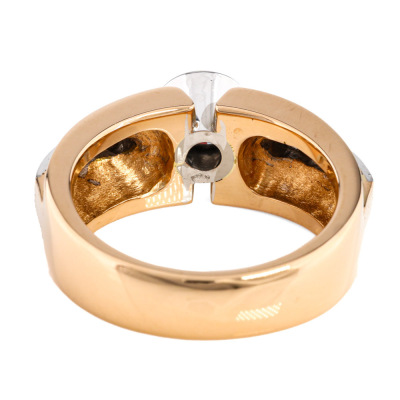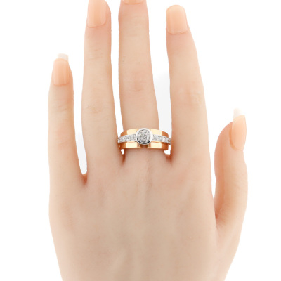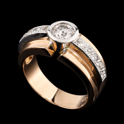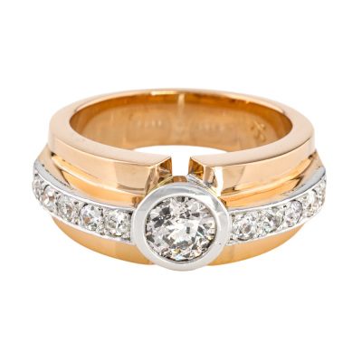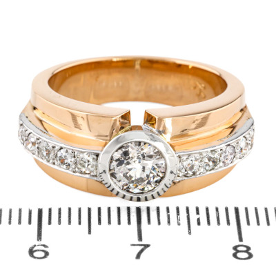 Diamond ring with centre old European cut Natural Diamond of approximately 0.75ct (Estimated grading: K-L P2) and 10 old mine cut Natural Diamonds totalling 0.40ct (Estimated grading: HIJ SI). 18ct rose and white gold. Ring size Q 1/2. Band width: 5.4mm - 6.8mm. Weight: 14.9g. (Pre-owned)