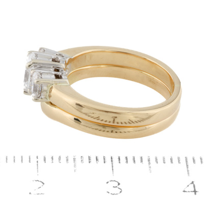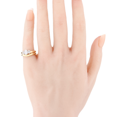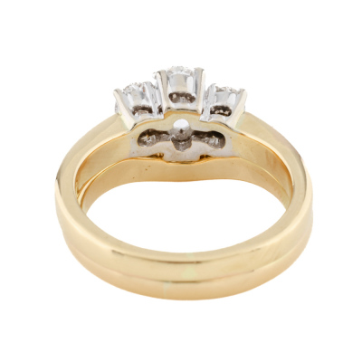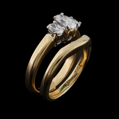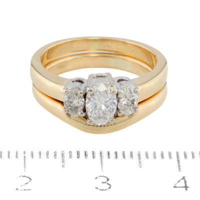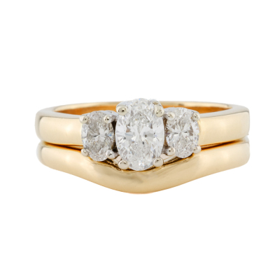 Trilogy Diamond ring and matching band ring set. 1) Trilogy Diamond ring with a centre oval shape Natural Diamond of approximately 0.40ct (Estimated grading: G VS-SI) and 2 side oval shape Natural Diamonds totalling approximately 0.36ct (Estimated grading: H VS-SI). 18ct yellow and white gold. Ring size I. Band width: 2.1mm - 2.5mm. 2) Matching band ring. 18ct yellow gold. Ring size H1/2. Band width: 2.2mm - 2.5mm. Total weight: 7.5g.