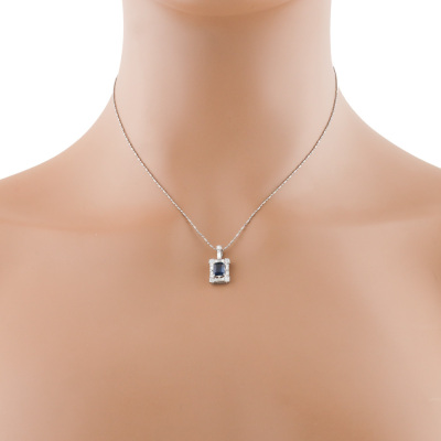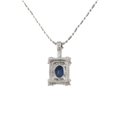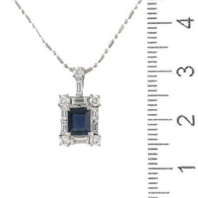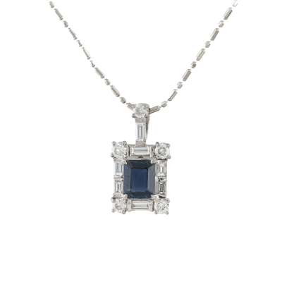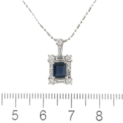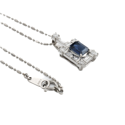 Sapphire and Diamond pendant with emerald cut Natural Blue Sapphire of 0.77ct and round & baguette cut Natural Diamonds totalling 0.51ct (Estimated grading: G-H VS). Platinum - 900 with 40cm Platinum - 850 chain. Weight: 3.8g. (Pre-owned)