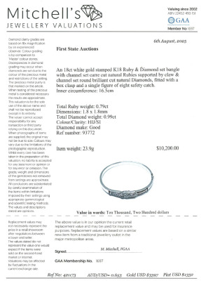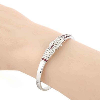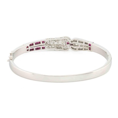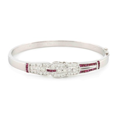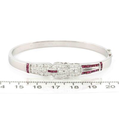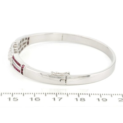 Art deco style bangle with carre cut Natural Rubies totalling 0.79ct and round Natural Diamonds totalling 0.99ct (Estimated grading: HIJ SI). 18ct white gold. Inner circumference: 16.5cm. Weight: 23.9g. With Certificate #421173. (Pre-owned)