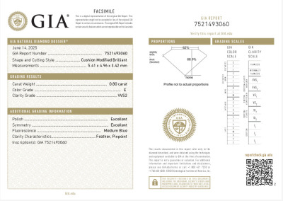 A loose cushion cut Natural Diamond of 0.80ct (with GIA Dossier Report graded as E VVS2 #7521493060