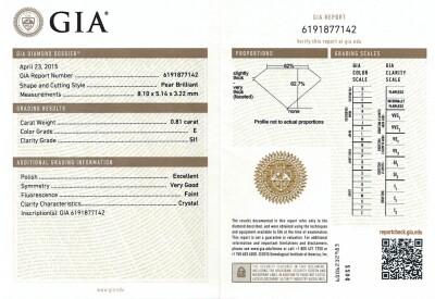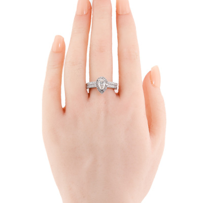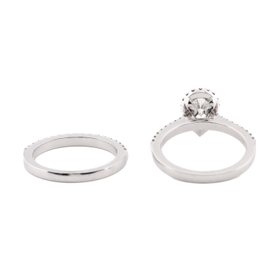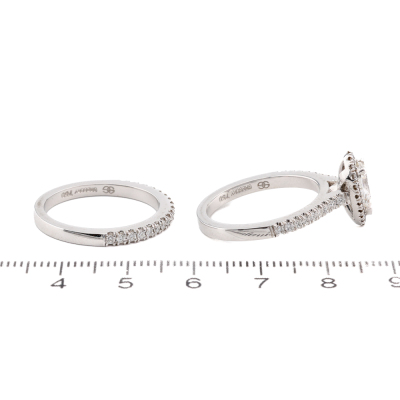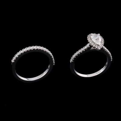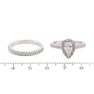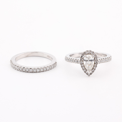 Diamond engagement ring set. 1) Diamond halo ring with centre pear shape Natural Diamond of 0.81ct (With GIA Report graded as E SI1 #6191877142) and round Natural Diamonds totalling approximately 0.59ct (Estimated grading: H-I SI). Ring size: P. Band width: 2.2mm. 2) Diamond eternity ring with 19 round Natural Diamonds totalling approximately 0.29ct. Both 18ct White Gold. Total weight: 10.6g. (Pre-owned)