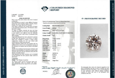 A loose round brilliant cut Natural Diamond of 0.81ct (With copy of GSL graded as Natural Faint Brownish Pink SI2 #AA65496)