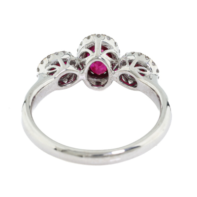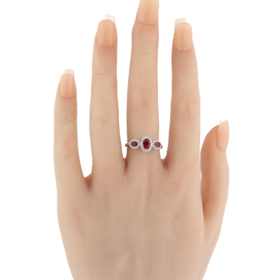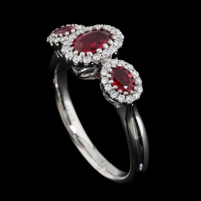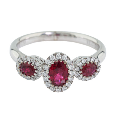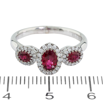 Ruby and Diamond ring with 3 oval shape Natural Rubies totalling 0.82ct and round Natural Diamonds totalling 0.20ct. 18ct white gold. Ring size L3/4. Band width: 2.2mm - 2.7mm. Weight: 4.2g. (Pre-owned)