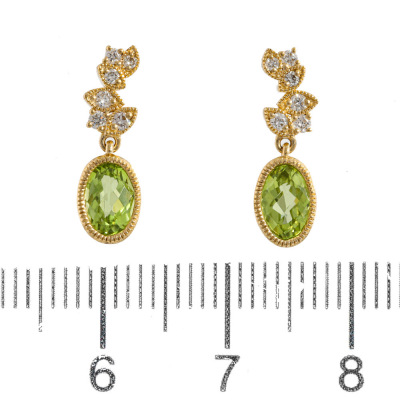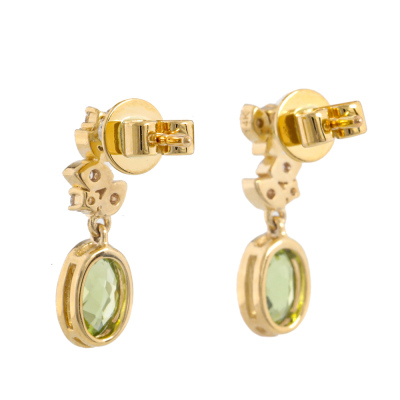 Peridot and Diamond drop earrings with oval shape Natural Peridot totalling approximately 0.85ct and round Natural Diamonds totalling 0.13ct. 14ct yellow gold