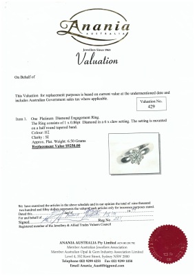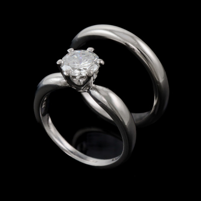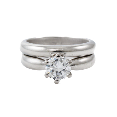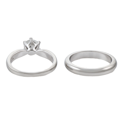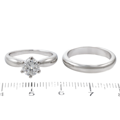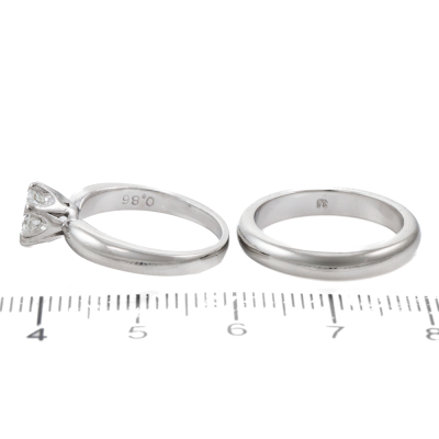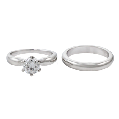 Diamond solitaire ring and ring band set. 1) Diamond solitaire ring with a round brilliant cut Natural Diamond of 0.86ct (FSA graded as: H SI). Ring size I1/2. Band width: 1.8mm-3.3mm. 2) Ring band. Ring size K. Band width: 3.2mm. Both Platinum - 950. Total weight: 12.39g. With Valuation Certificate for solitaire ring dated 20/09/1999. (Pre-owned)