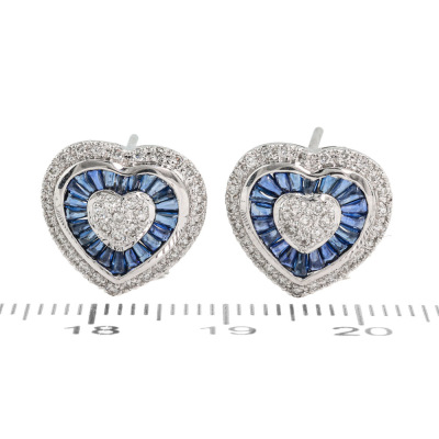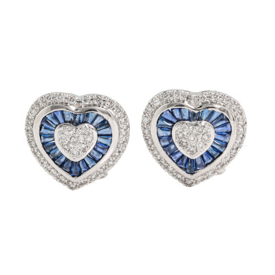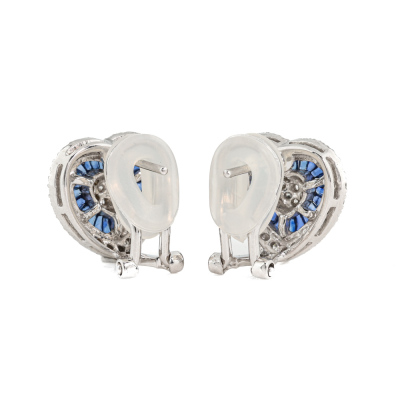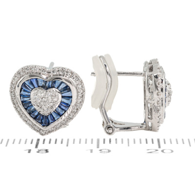 Heart design clip-on earrings (for pierced ears) with cabochon baguette cut Natural Blue Sapphires totalling 0.87ct and round Natural Diamonds totalling 0.30ct (Estimated grading: H-I SI). 18ct white gold. Weight: 5.8g. (Pre-owned)