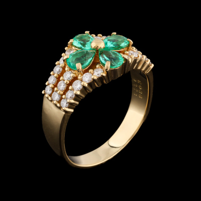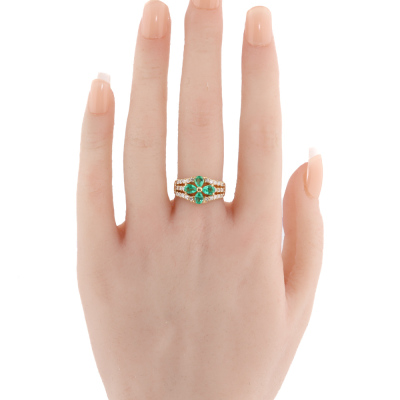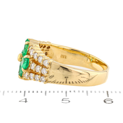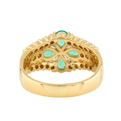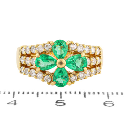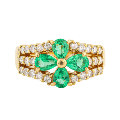 Emerald and Diamond ring with 4 pear shape Natural Emeralds totalling 0.88ct and round Natural Diamonds totalling 0.53ct (Estimated grading: H-I SI-P1).18ct yellow gold. Ring size L. Band width: 3.4mm - 5.2mm. Weight: 6.2g. (Pre-owned)