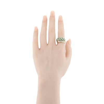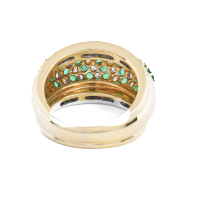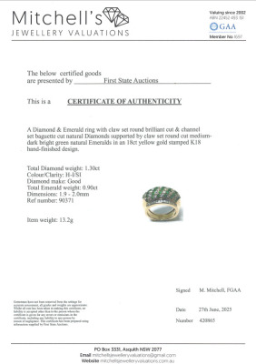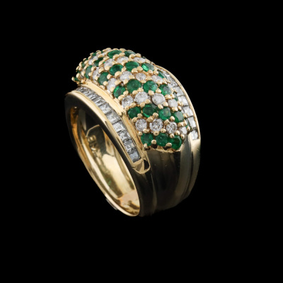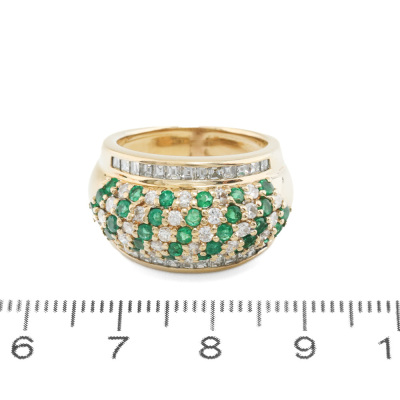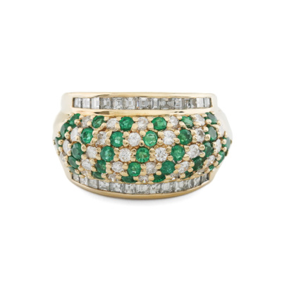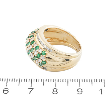 Emerald and Diamond ring with round Natural Emerald totalling 0.90ct and round & carre cut Natural Diamonds totalling 1.30ct (Estimated grading: H-I SI). 18ct yellow gold. Ring size L. Band width: 5.1mm - 11.8mm. Weight: 13.2g. With Certificate #420865. (Pre-owned)