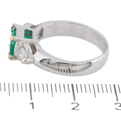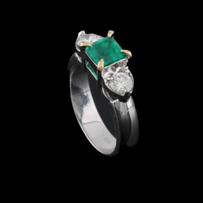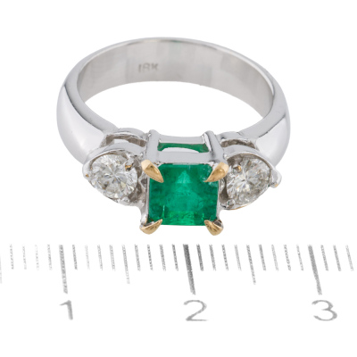 RTE ( Return to supllier) Emerald and Diamond ring with centre square emerald cut Natural Emerald of approximately 0.90ct and two round Natural Diamonds totalling approximately 0.50ct (Estimated grading: H SI). 14ct white gold with yellow gold plated claws (XRF tested, stamped 18k). Ring size: K. Band width: 4.3cm. Weight: 6.2g.