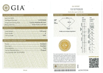A loose cushion cut Natural Diamond of 0.90ct (with GIA Dossier Report graded as D VVS1 #1515793520