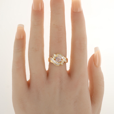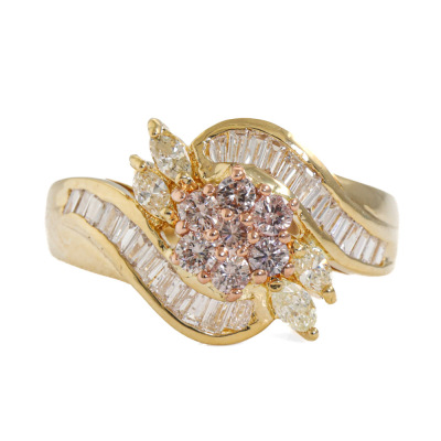 Diamond ring with centre 7 round Natural Pink Diamonds approximately 0.28ct (one of Diamond of 0.04ct with GSL Memo graded as Natural Fancy Light Purplish Pink P1 #AA70294-4), 4 marquise cut Natural Light Yellow Diamonds totalling approximately 0.24ct and baguette cut Natural white Diamonds totalling approximately 0.38ct (Estimated grading for white Diamonds: I-J SI). 18ct yellow gold. Ring size L. Band width: 2.4mm - 4mm. Weight: 5.0. (Pre-owned)