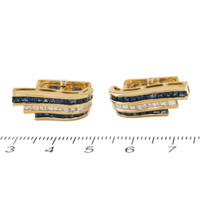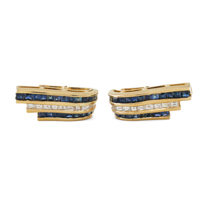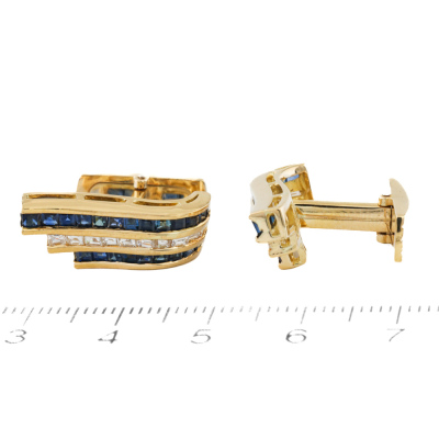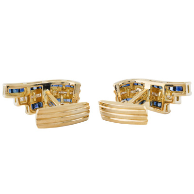 Cufflinks with carre cut Natural Blue Sapphires totalling approximately 0.90ct and baguette cut Natural Diamonds totalling approximately 0.40ct (Estimated grading: I-J SI) 18ct yellow gold. Weight: 13.0g. (Pre-owned)